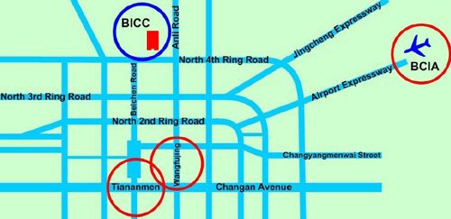 BICC is on the North 4th Ring Road of Beijing and along the capital axis line. It is 20 kilometers from the Beijing Capital International Airport (BCIA) and 9 kilometers from the city center.